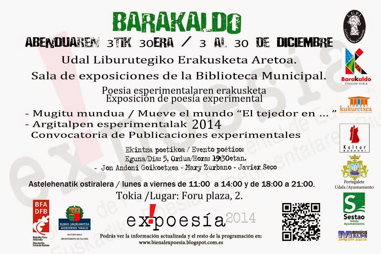 Os invitamos a participar en las muestras que la Bienal de Poesía Experimental de Euskadi, ex!poesía 2014, fomentará con vuestras publicaciones editadas entre el 2008 y el 2014, relacionadas con la poesía experimental, se admitirá todo tipo y formato; Libro, Revista Objeto, Libro Artista, Fanzin, Revista de Ensamblaje … etc. con todo el material recibido se publicará el Dossier de Publicaciones de Poesía Experimental 2014.