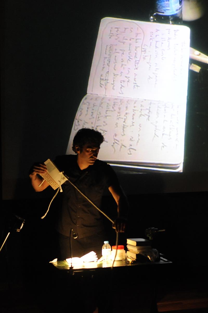 Y presenta a Roberto Ekisoain, quién en un susurro casi imperceptible desmonta un paraguas en escena para regocijo de los que miran. Porque los poemas de Ekisoain no transitan para ser leídos. Sus poemas son actos. Por ello, sujeta un libro de una larga soga y lo mueve en círculos sobre su cabeza hasta que el libro habla. Y luego dice así suena El tejedor en… Berlín (L.U.P.I. 2014). A través de una pantalla nos muestra su quehacer en escena: sus manos sellando con pegamento los últimos ejemplares de una edición agotada para su proyecto Textos Herméticos. Nos ofrece el libro del viento en el siseo de sus hojas, y el sonido de un silbato que lo acompaña. Y por fin, lee. Lee el Apocalipsis No , que no es más que el libro del Apocalipsis con la palabra no antes de cada verbo. Y lo hace así, acompañado por el público, para que la profecía del libro no se cumpla. Después, abandona el escenario como llegó a él, en un susurro.