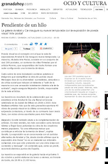 Cada sobre de esta instalación contiene palabras e imágenes que ejemplifican la idea de poesía visual. Mensajes ricos en su diversidad: surrealistas, absurdos o de crítica social que inducen al visitante a «salir de la muestra con una sensación totalmente distinta a la de la entrada», según asegura Alejandro Gorafe, responsable de la sala artística. Leer el artículo