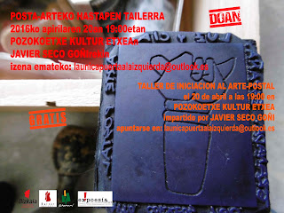 La Casa de Cultura de Basauri en colaboración con el Area de Inmigración del Ayuntamiento de Basauri y dentro de la programación de ex!poesia 2016 (Bienal de Poesía Experimental de Euskadi / Euskadiko Poesia Esperimentalaren Biurtekoa) organiza un taller de iniciación al arte postal con el objeto de dar a conocer esta forma de expresión y comunicación.